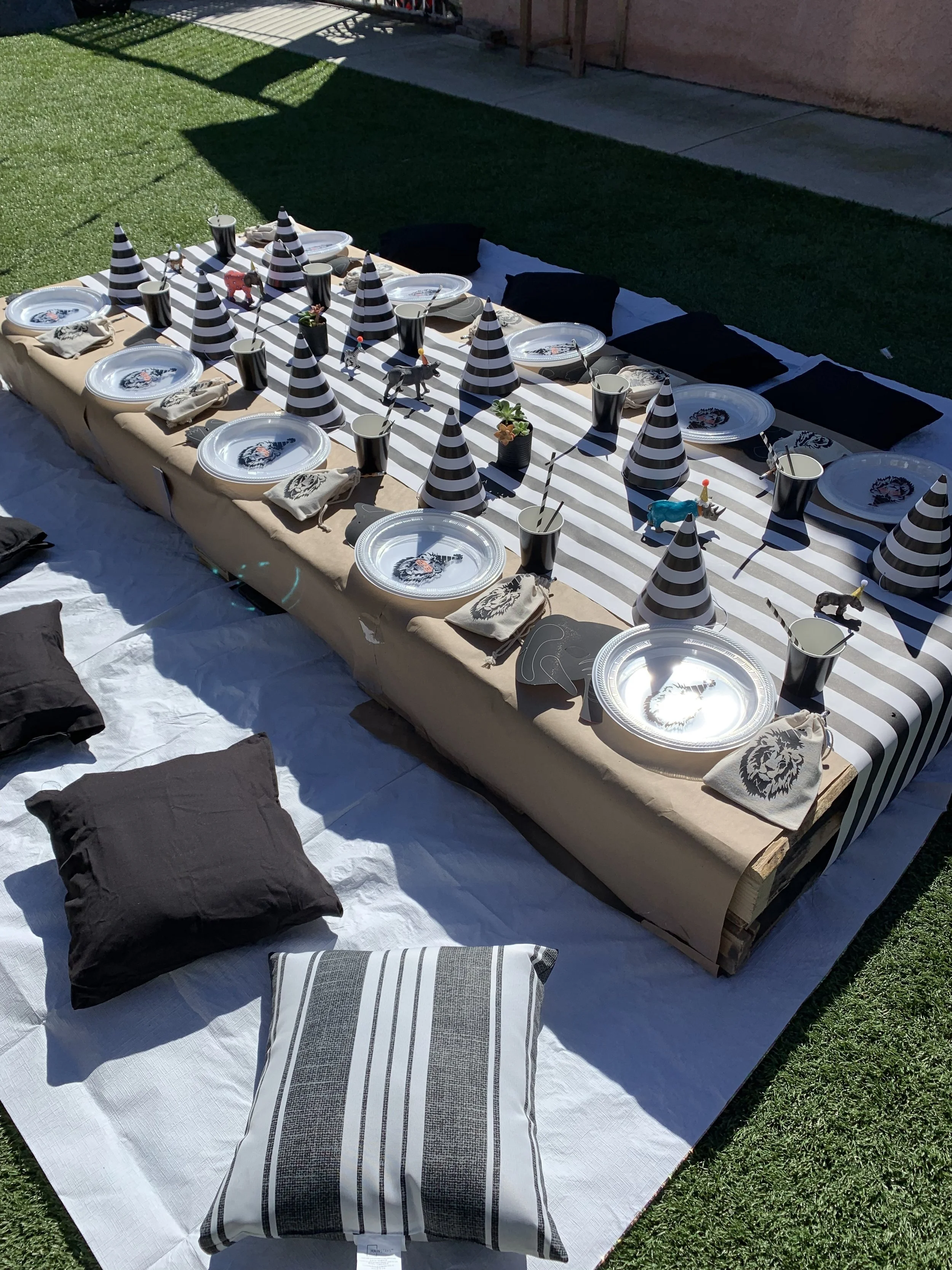 The top of the table I used a black and white striped paper as my table runner. Each place setting had a striped party hat, a cup & paper straws, a goodie bag, and an animal mask to decorate. In the center of the table we lined it with succulent plants which we made DIY vases out of used cans. We spray painted cans black and planted succulents in them. We also had on the table our “party animals” the plastic animal figures that we painted and decorated with small DIY party hats.
