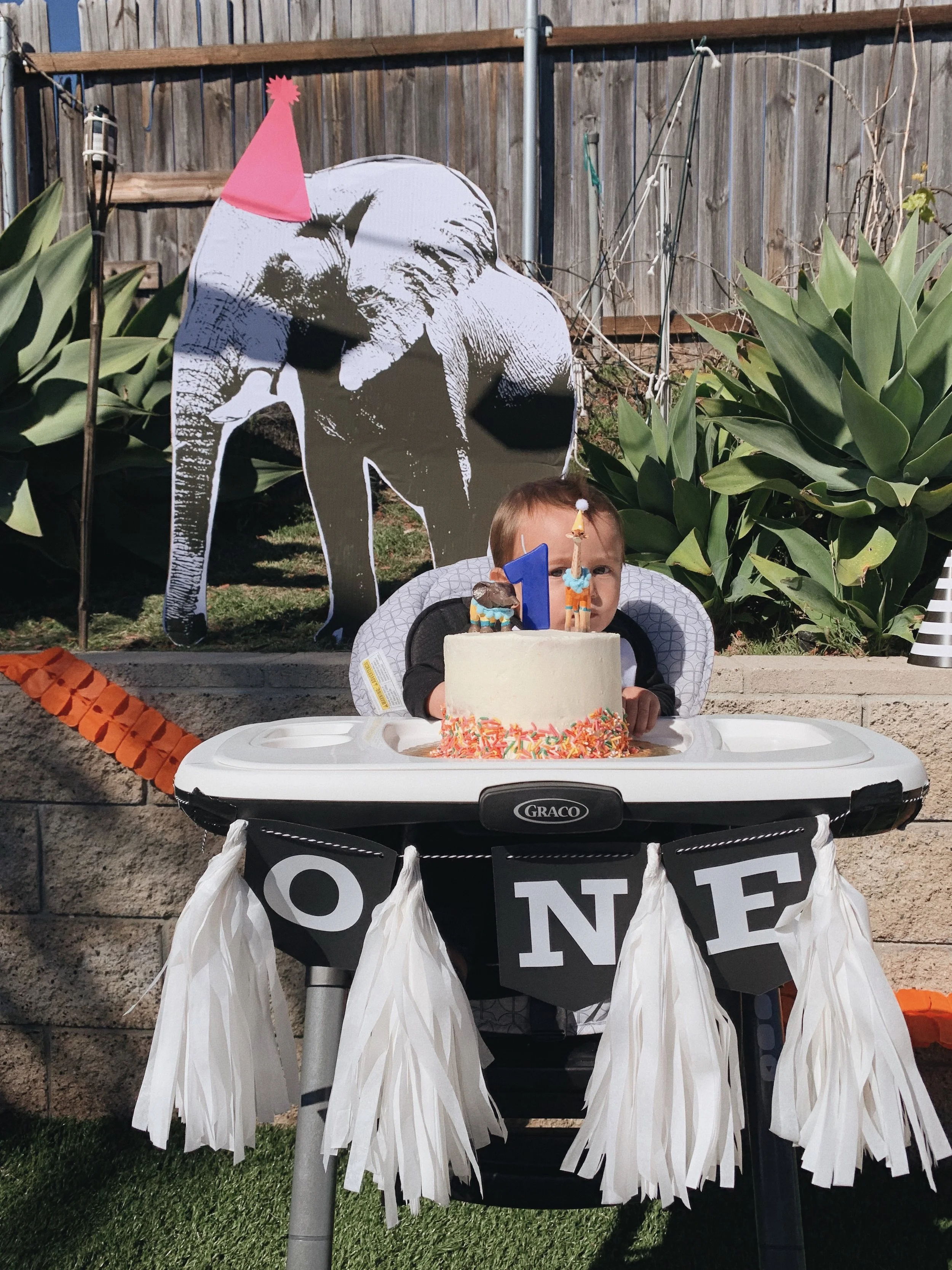 I considered do a “healthy” smash cake, but to be honest my child doesn’t even like sweets so I wasn’t concerned about him eating the cake. I knew it would be an uneventful smash cake event, we did a smash cake for his actual birthday and he played with it a little but he didn’t really care for it. A good friend of ours who usually makes all of our party cakes made this smash cake for us. It was Funfetti cake with a yummy buttercream frosting with sprinkles. I bought a number 1 candle from target dollar spot and I placed a couple party animals I painted on top!