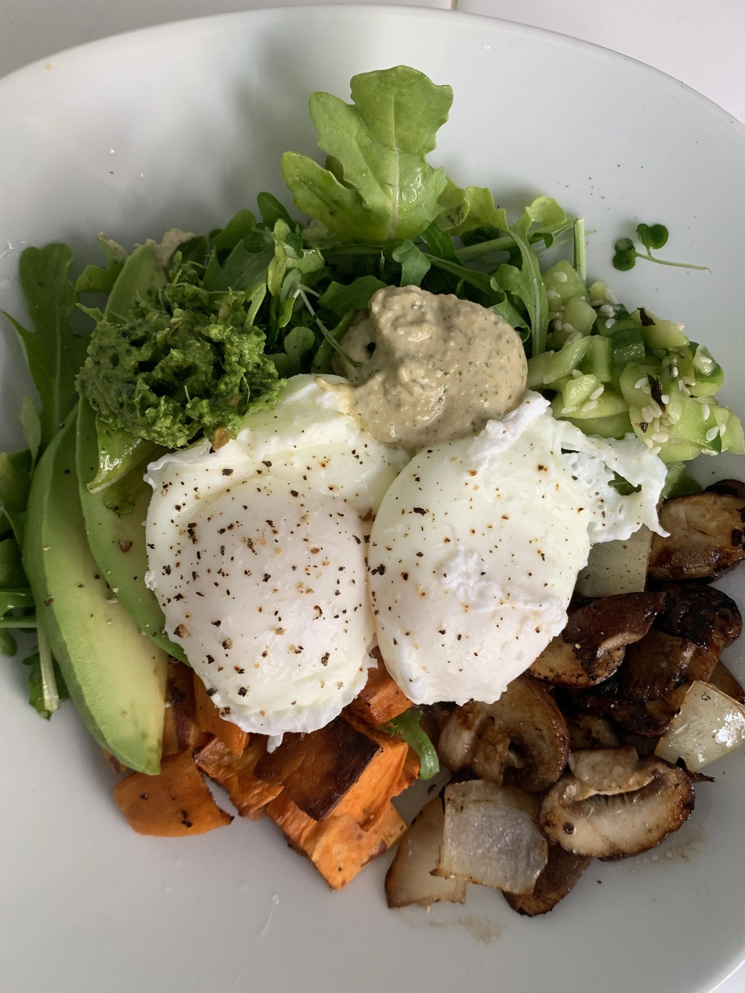 With this bowl there are so many different options you can create. For breakfast this morning I didn't use my quinoa, but I used everything else and I added poached eggs. Adding eggs makes it a healthy breakfast option! This recipe can be made vegan as well with using vegan protein options. Get creative