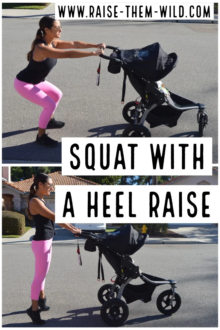 3. Squat with a heel raise- Face your stroller lightly place Your hands on your stroller, keep your chest up & slowly lower those hips into a squatting position. Keep the weight in your heels. As you press up from that squat stand all the way up on your toes squeezing those glutes and your calves. Repeat x 10